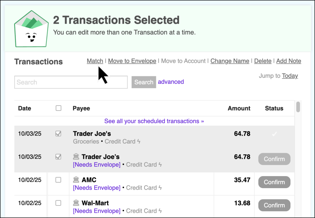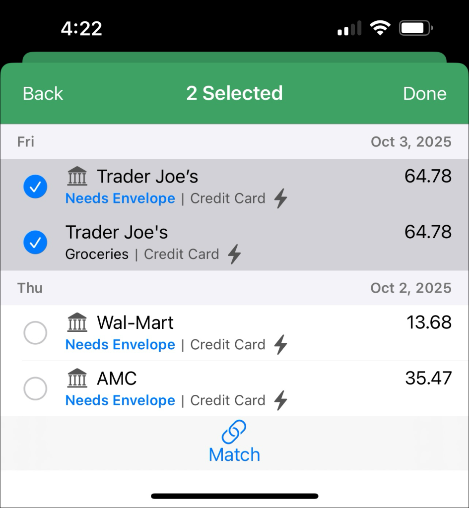 Now, you can manually Match these entries together to create a single merged transaction.