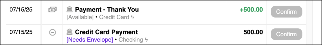 For example, if you’ve linked both a checking account and a credit card account to Goodbudget, you may end up with two transactions, a credit and an expense, that represent your credit card payment.