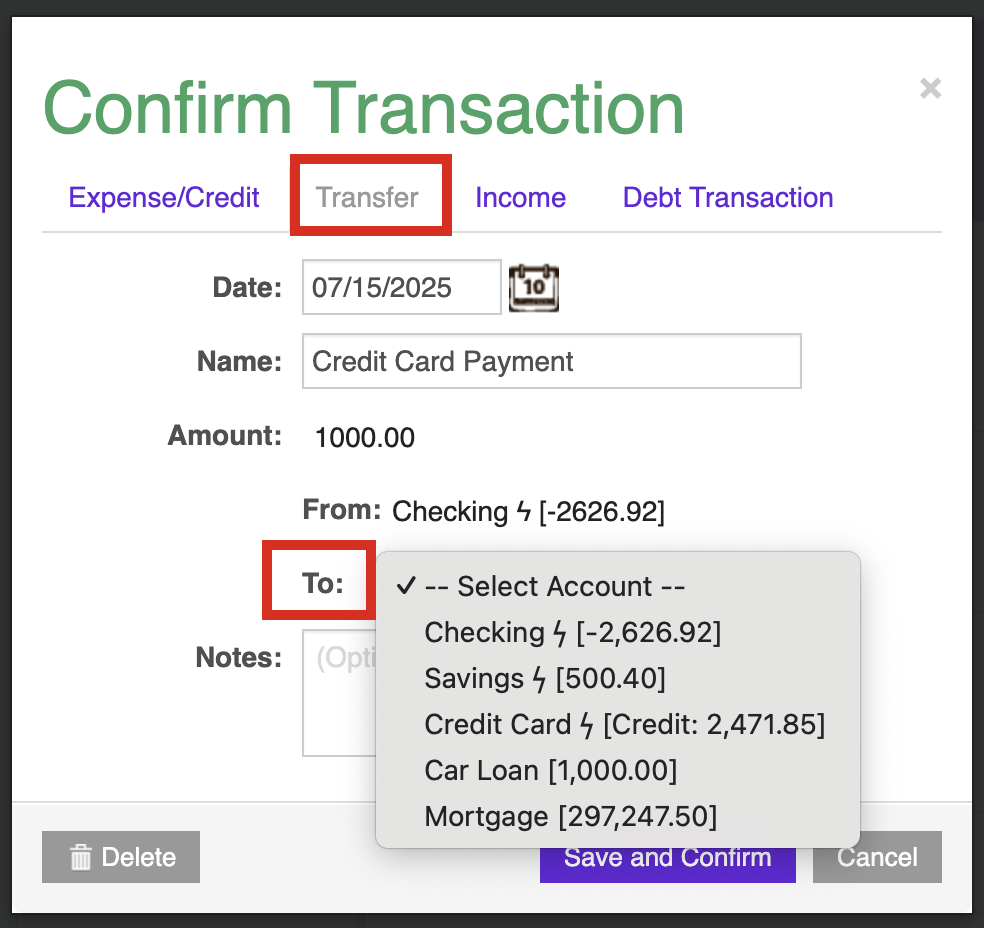 When the first half of your payment syncs down, convert it to an Account Transfer. If the transaction is negative, you’ll convert it into an Account Transfer by clicking on the ‘Transfer’ tab at the top of the ‘Confirm Transaction’ module, and then selecting which Account the funds are going to. If it’s positive, you’ll select ‘Transfer’ as its type first before selecting which Account the funds came from.
